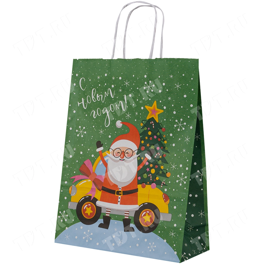 Бумажный подарочный пакет с крученой ручкой и новогодним рисунком «Дед Мороз и ёлка» шириной 110 мм, длиной 250 мм, высотой 320 мм изготовлен из крафт бумаги плотностью 80 г/м². Пакеты производятся в России.