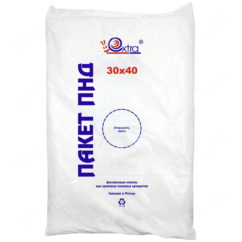 Прозрачные фасовочные пакеты ПНД в пластах «EXTRA», особопрочные для упаковки длиной 40 см, шириной 30 см, толщиной 10 мкм, в упаковке по 1000 штук. Материал – полиэтилен низкого давления. Отвечают требованиям ГОСТа на плёнку ПНД (16338-85). Производятся в России.