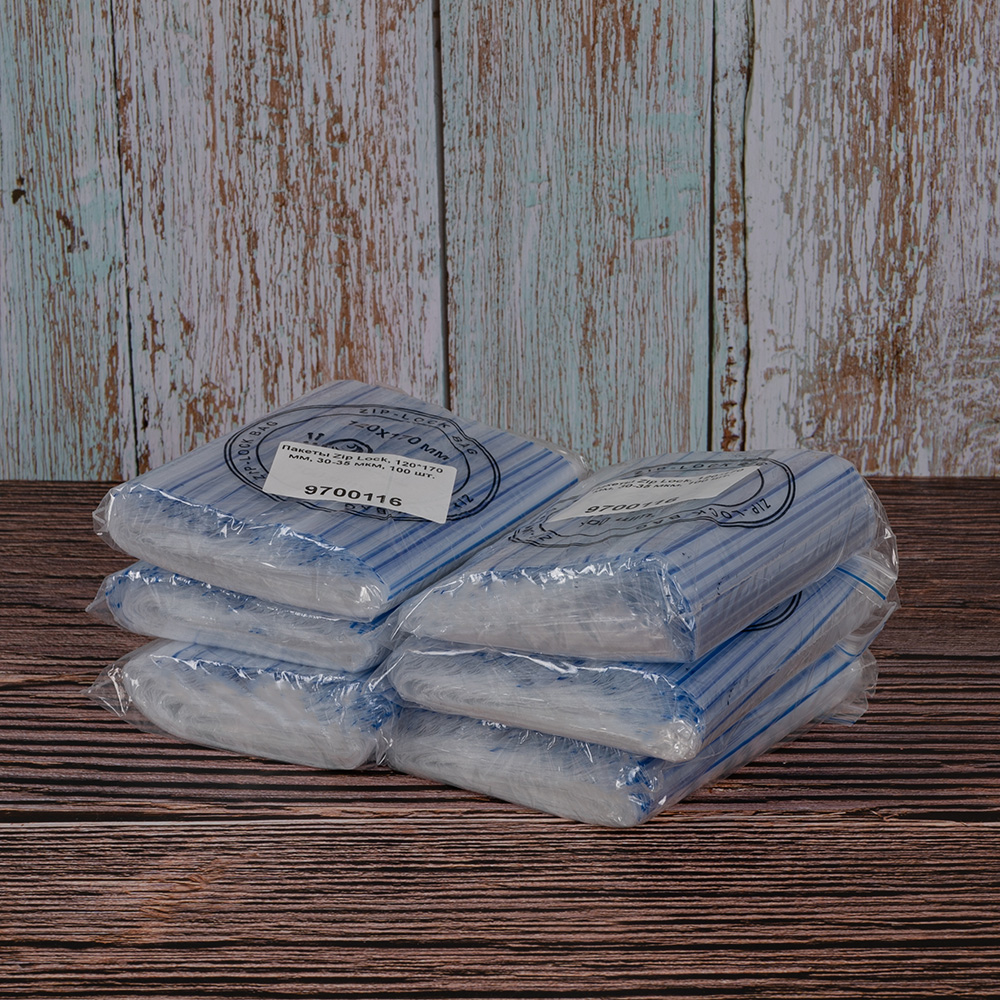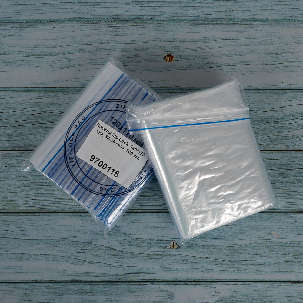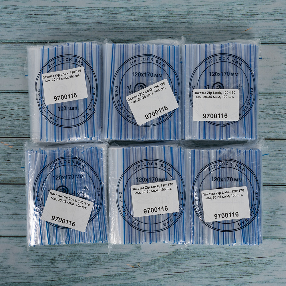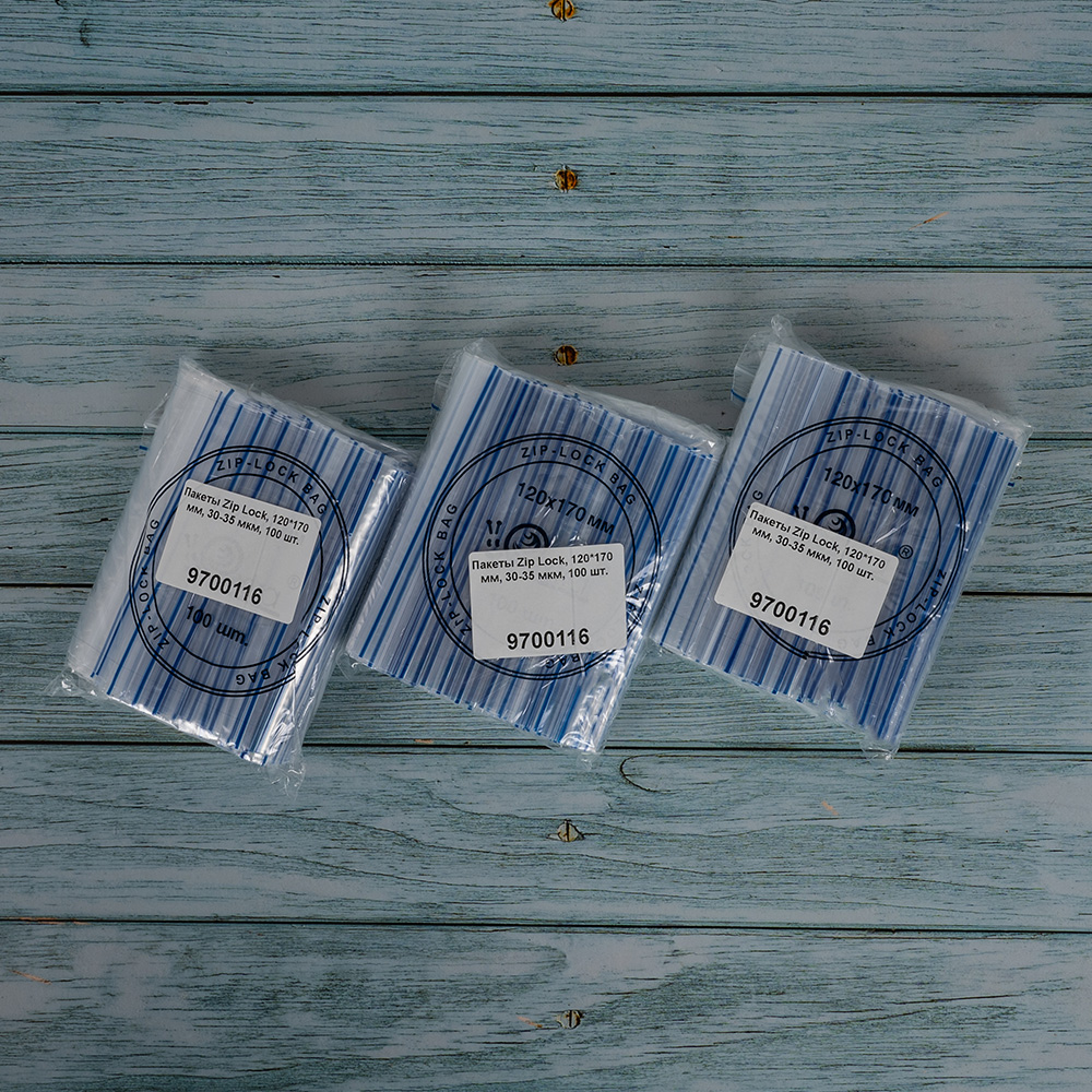 Пакеты Zip-Lock, прозрачного цвета с синей или красной полосой, длиной 170 мм, шириной 120 мм, толщиной 30-35 мкм, в упаковке по 100 штук. Материал – полиэтилен высокого давления (ПВД). Производятся в Китае.
