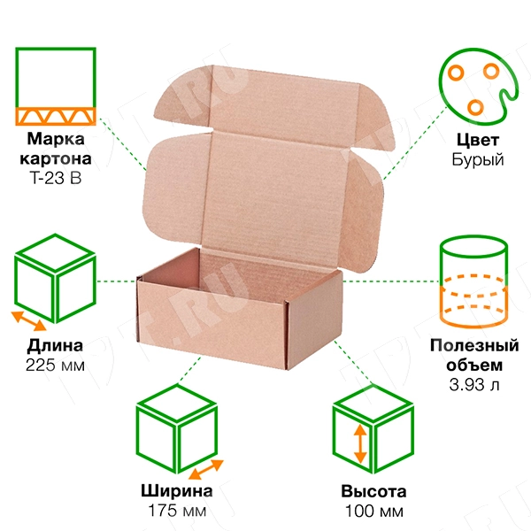 Короб КС-235 бурого цвета, длиной 225 мм, шириной 175 мм и высотой 100 мм. Изготовлен из трёхслойного гофрокартона Т-23 В. Полезный объём — 3.93 л.