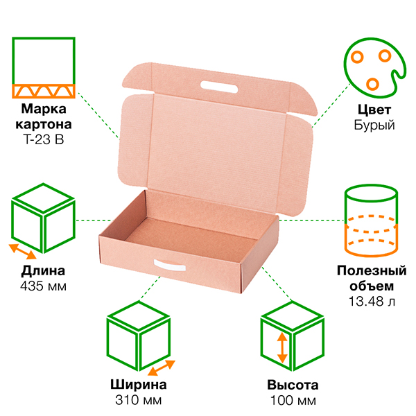 Бизнес Бокс А3 бурого цвета, длиной 435 мм, шириной 310 мм и высотой 100 мм. Изготовлен из гофрокартона Т-23 В. Полезный объём — 13.48 л.