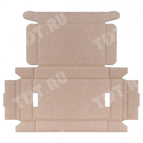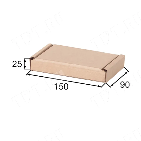 Короб КС-245 бурого цвета, длиной 150 мм, шириной 90 мм и высотой 25 мм. Изготовлен из трёхслойного гофрокартона Т-23 В. Полезный объём — 0.3 л.