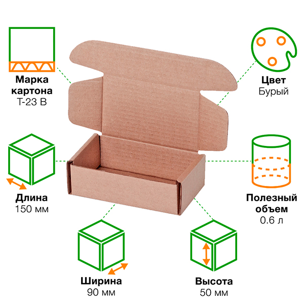 Короб КС-248 бурого цвета, длиной 150 мм, шириной 90 мм и высотой 50 мм. Изготовлен из трёхслойного гофрокартона Т-23 В. Полезный объём — 0.6 л.
