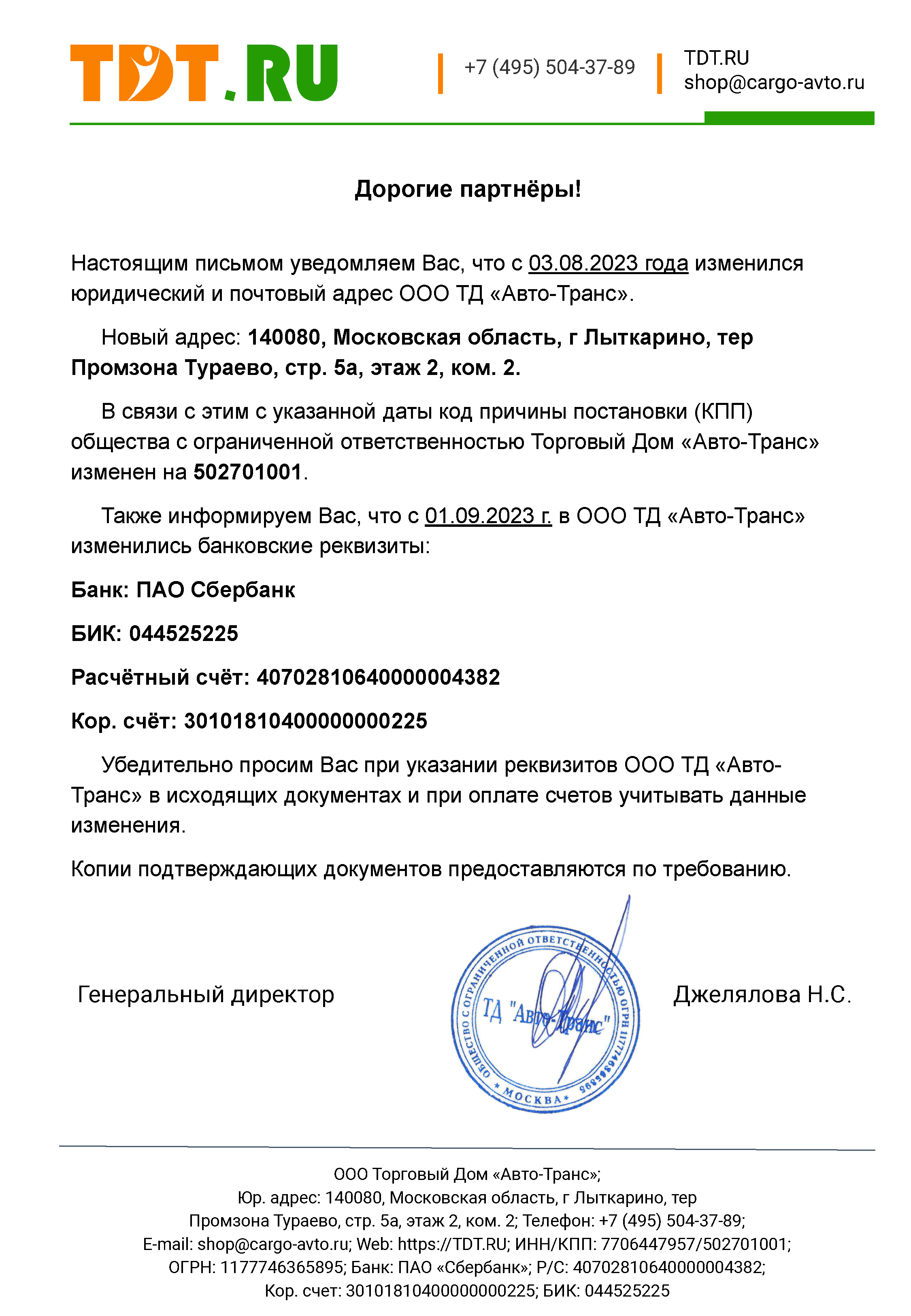 Официальное письмо можно скачать тут. Все реквизиты ООО ТД «Авто-Транс» можно посмотреть тут.