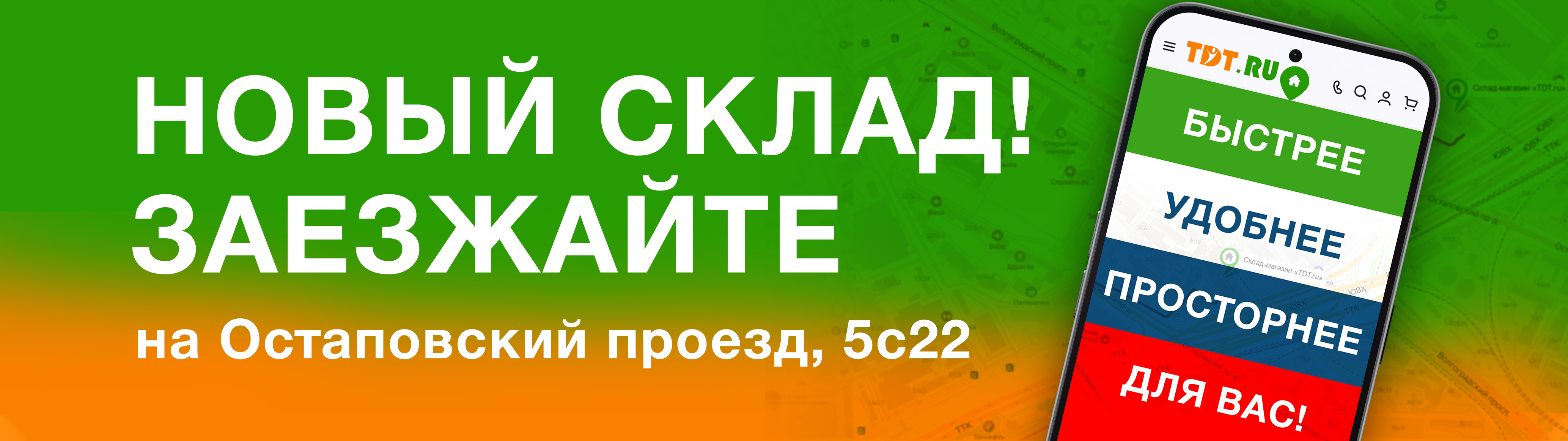Мы открываем новый склад-магазин в Юго-Восточном округе Москвы! У нового филиала улучшены пешая и транспортная доступность: он расположен рядом с Третьим транспортным кольцом между метро Угрешская и Новохохловская.
